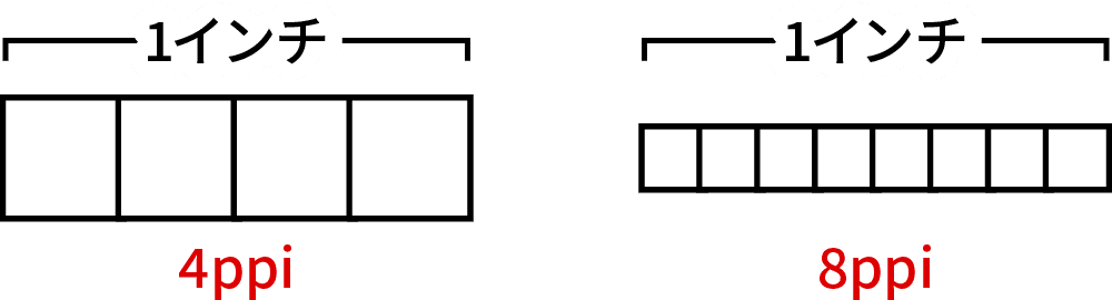 図に表すと、1インチ(横幅)にいくつピクセルが詰まっているかを数値化したものです。
