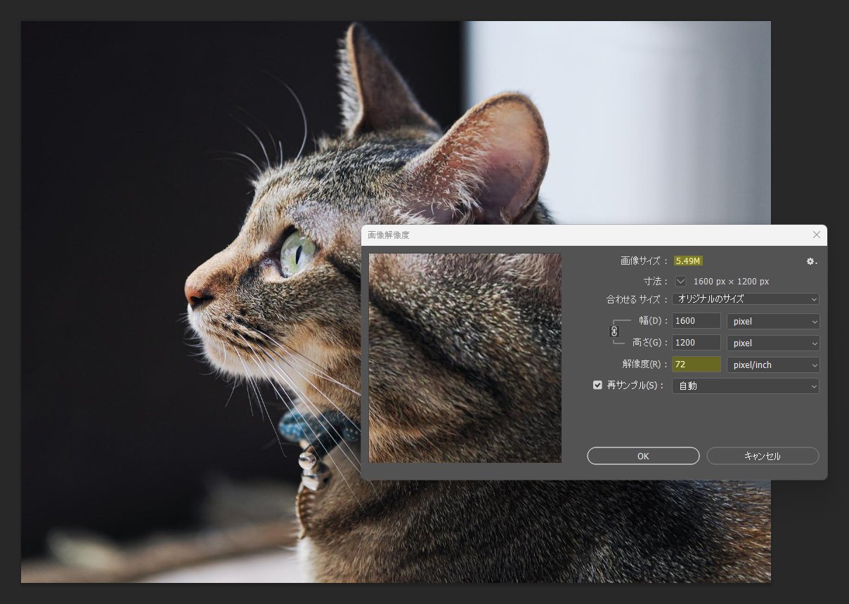 72dpi、横1600px 縦1200px、バイト数が5.49MBの猫チャン